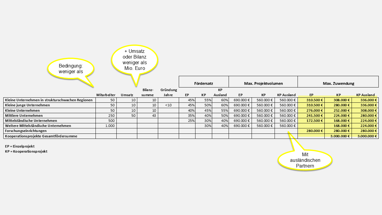 - Partneranzahl: Mindestens 6 KMU-Netzwerkpartner, bei internationalen Innovationsnetzwerk mindestens 4 deutsche KMU-Netzwerkpartner, zusätzlich Forschungseinrichtungen und Großunternehmen als assoziierte Partner
