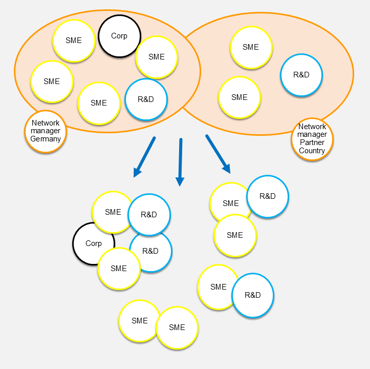 - Partneranzahl: Mindestens 6 KMU-Netzwerkpartner, bei internationalen Innovationsnetzwerk mindestens 4 deutsche KMU-Netzwerkpartner, zusätzlich Forschungseinrichtungen und Großunternehmen als assoziierte Partner
